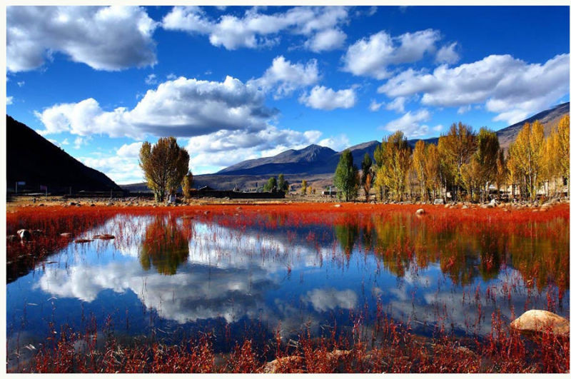 一早从稻城出发,前往桑堆的途中可以拍摄红草地(该景点为季节性景观,只有在每年的九月中旬到十一月上旬才能看到红草),在秋天的时候,配合上后面泛黄的桦树,倒映在水塘中,是非常漂亮的一道美景。之后再次翻越海子山自然保护区(平均海拔4500多米),在理塘用过午餐后,沿318国道一路向东,翻卡子拉山、剪子湾山、经雅江县城后,翻高尔寺山,抵达新都桥镇,宿新都桥。